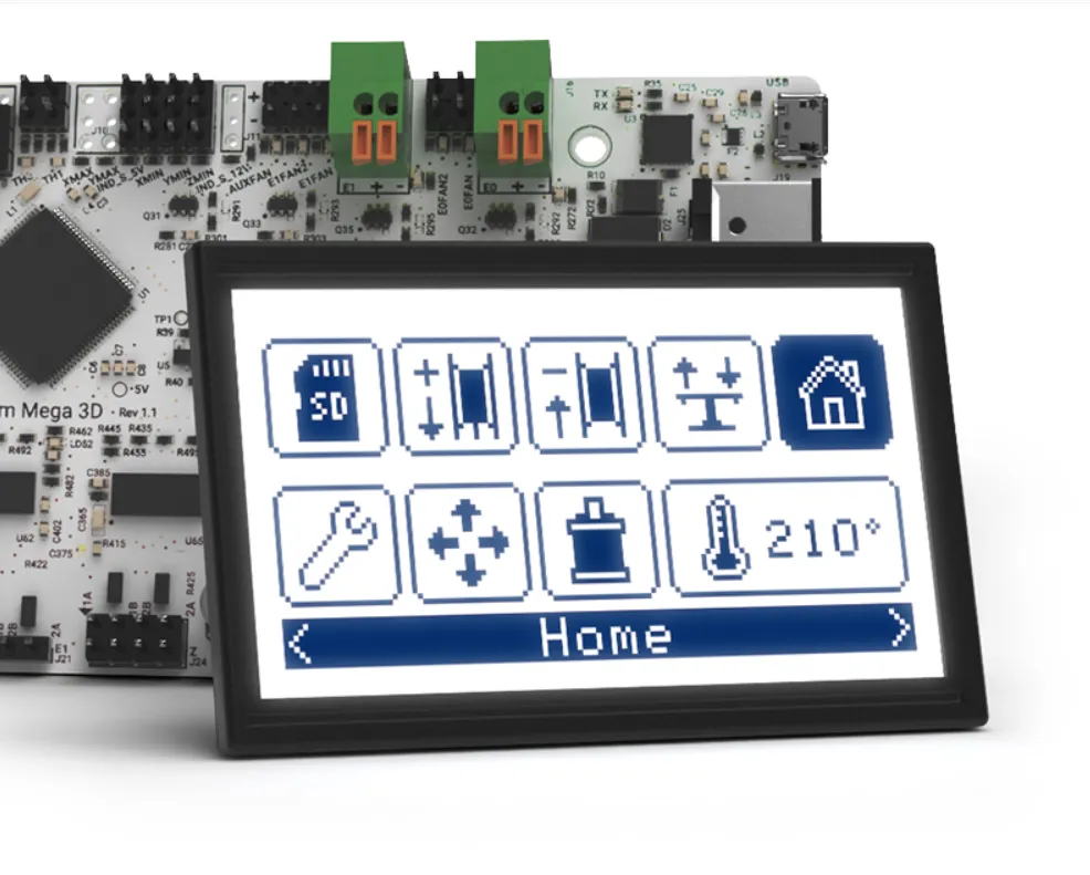 Все основные электронные компоненты принтера Hephestos 2 интегрированы в одну-единственную плату: Zum Mega 3D. Данная плата, разработанная компанией BQ, содержит в себе новые функции и имеет возможность подключения через разъем микро-USB. Она способна обеспечить 3D-принтеру плавное движение всех моторов и гарантирует лучший теплоотвод, по сравнению с прежними решениями. Кроме того, мы разработали электронные компоненты управления новым графическим ЖК-дисплеем. Теперь его интерфейс стал более интуитивным и сильно упрощающим Вашу работу.