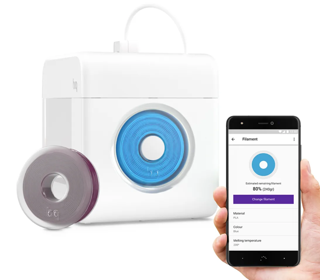 Zetup указывает пользователю путь и помогает облегчить процесс загрузки. Выбор первоначальной конфигурации автоматический. Технология NFC наших катушек PLA (разработанных точно по меркам) передает информацию о цвете или количестве нити прямо в принтер. Начать работать с Witbox Go! так просто, что первую печать можно сделать после вскрытия коробки.