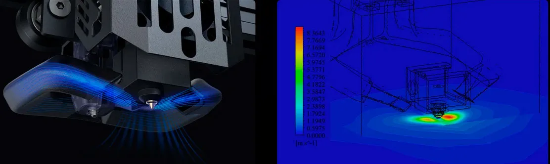 5. Двойной обдув слоев в вентиляторе 5015 обеспечивают воздуховоды «Urus», направляя сильный поток воздуха на осажденный горячий материал, что способствует быстрому “схватыванию”, таким образом меньше свисая или деформируясь.