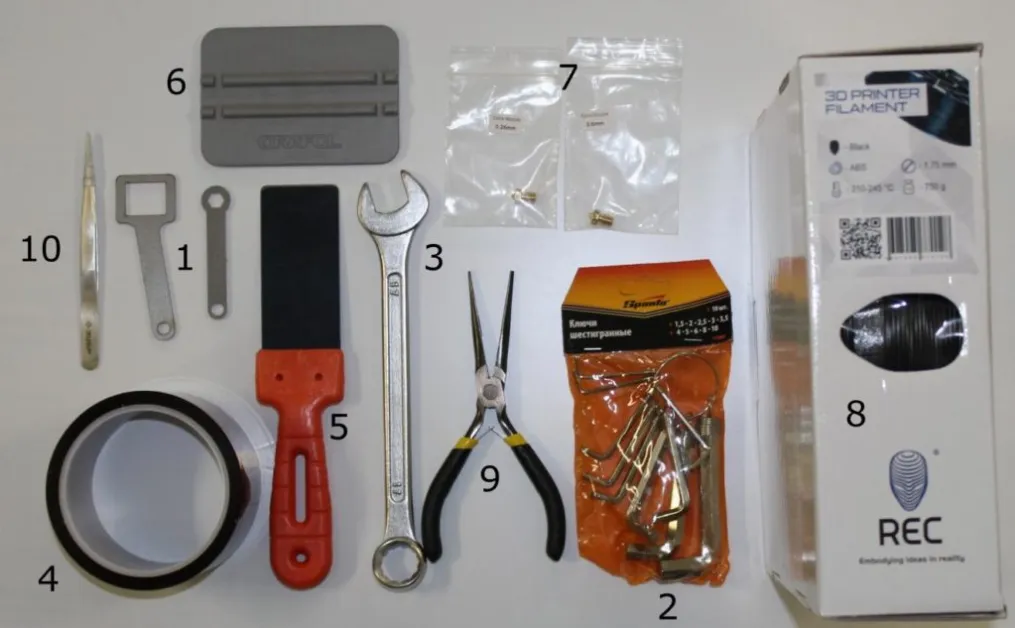 В комплекте с 3D-принтером идёт целый набор аксессуаров: