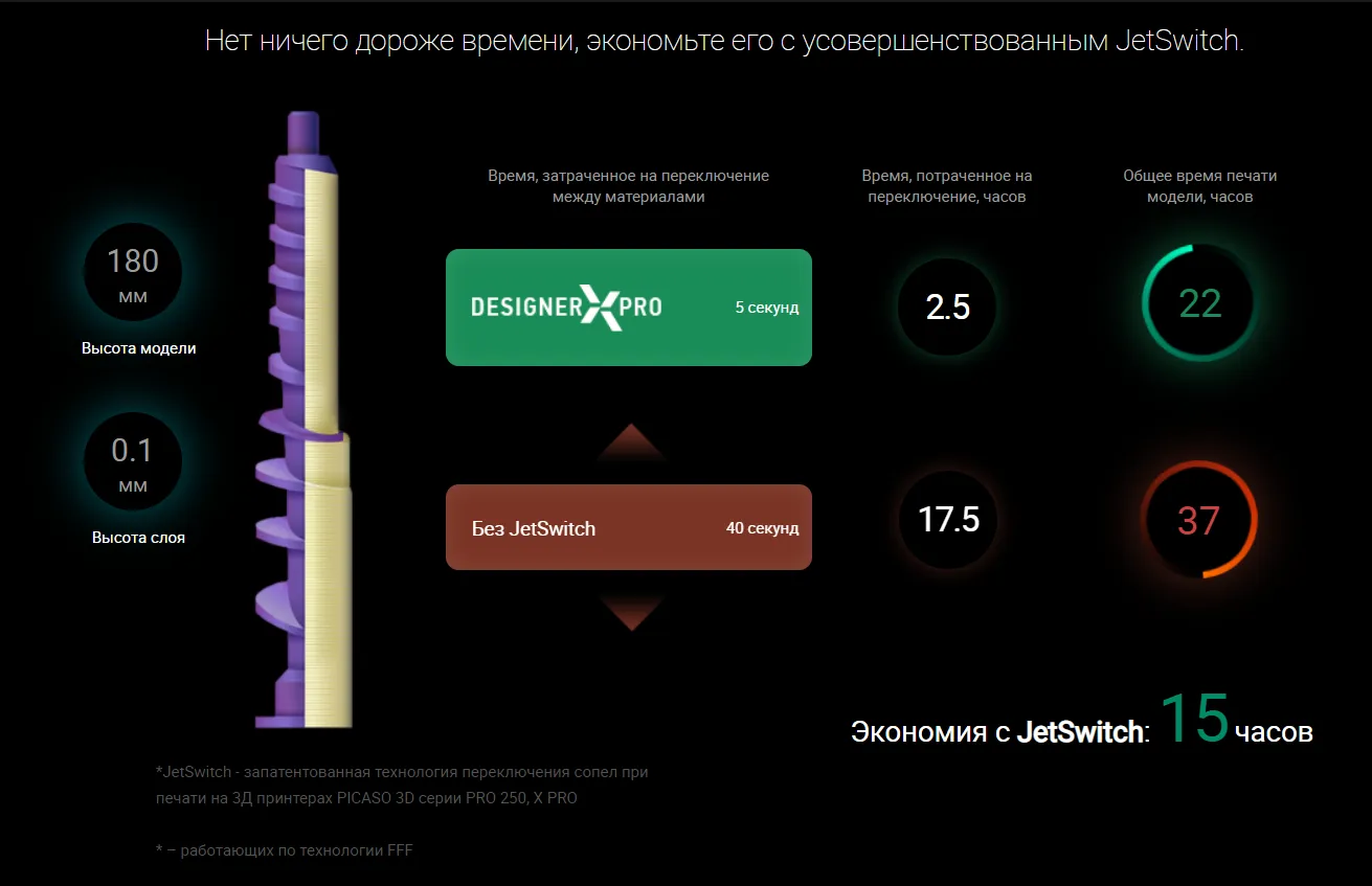 Принтер поддерживает печать инженерным высокотемпературным пластиком Ultran (угленаполненный 30% полиамид), который позволяет производить изделия промышленного качества и назначения. Стальных сопел принтера при печати таким сложным материалом хватает на 720 часов непрерывной работы.