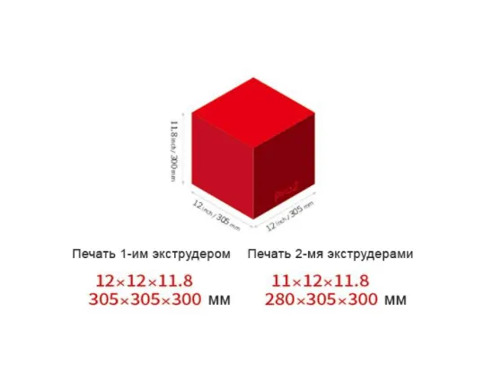 | Область построения | 305х305х300 мм – при печати 1-им экструдером; 280х305х300 мм – при печати 2-мя экструдерами |