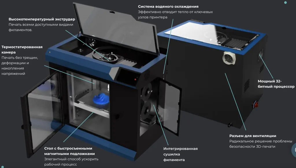 - Термостатированная камера до 120°С. Печать без трещин, деформации и накопления напряжений.