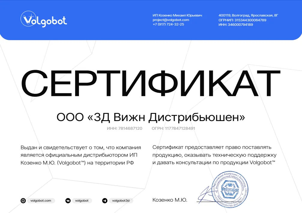 3DTECH является официальным дистрибьютором продукции Volgobot:
