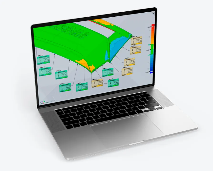 Программное обеспечение RangeVision ScanCenter NG или программы метрологического контроля поверхностей позволяют осуществлять быстрый 3D-контроль геометрии без контакта с объектом и получать точные 3D-данные. Это позволяет уловить малейшее отклонение геометрии. Контроль отклонения сетки от номинальной поверхности осуществляется с помощью визуализации в виде цветовой карты и проведения измерений в каждой отдельной точке проверяемой 3D-сетки.