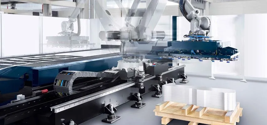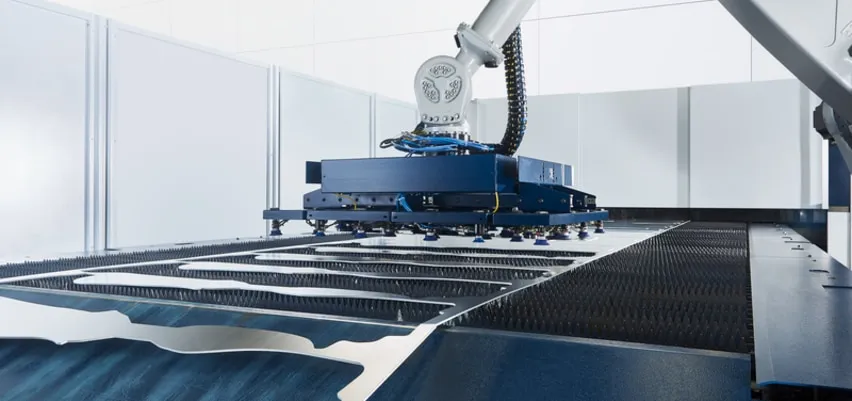 Один или опциально два робота выполняют параллельную основному машинному времени разгрузку и штабелирование с точностью повторения. Полная интеграция кинематики робота в архитектуру системы управления делает знания программирования роботов избыточными. Уже на этапе программирования в TruTops Boost определяется раскладка деталей для резки, съем с помощью робота, а также укладка на палеты.