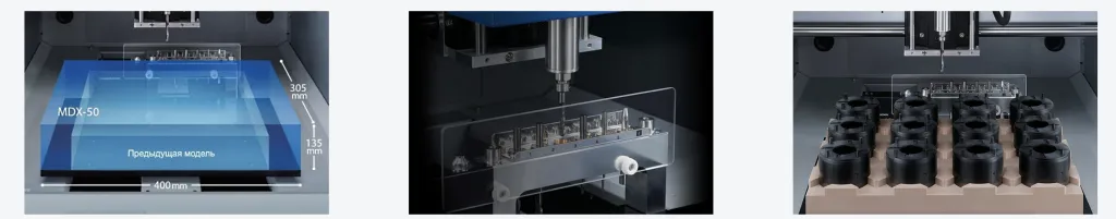 MDX-50 идеально подходит как для организации учебного процесса, так и для промышленных и ювелирных задач. Обрабатывая модельные промышленные пластики, вы сможете получать полнофункциональные прототипы и корпусные изделия для небольших серий. Кроме корпусных деталей, MDX-50 позволяет выполнять гравировку и сверление отверстий для создания печатных плат. Автоматическая смена инструмента и поворотная ось позволят делать эти операции в автоматическом режиме. Программное разрешение в 0.001мм, а также использование поворотной оси, позволяют успешно использовать станок в ювелирном производстве. Высокая точность станка, позволяют использовать его для фрезеровки колец, подвесок и барельефов из модельного воска, для последующего литья по выплавляемым моделям.